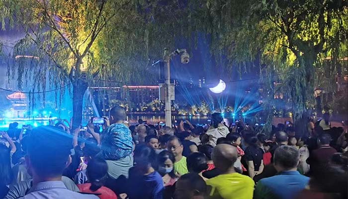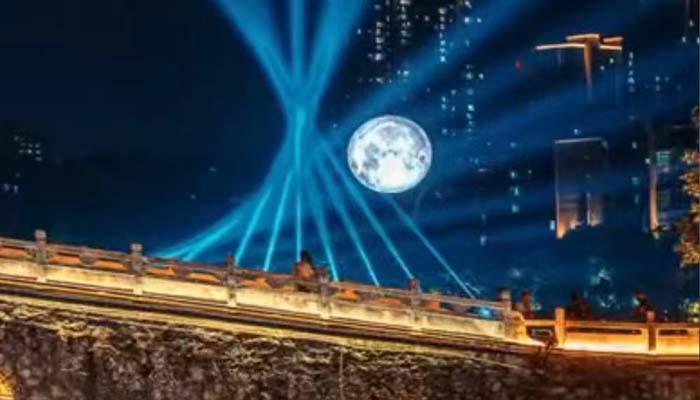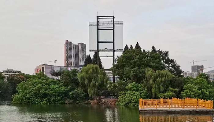 月亮升降装置设置于郴州北湖湖中的岛上,用于在夜间表现“明月高悬”的美丽景观。该装置主要由支撑结构、户外LED网格屏、升降装置、电气控制、支撑柱基础组成。户外LED网格屏夜间显示月亮图案,可通过升降装置提升到26米的高度,呈现出月亮当空悬挂的效果,展示完毕后,可通过卷扬系统将LED屏降至地面。该项目由我公司设计制作,目前已投入参与演出,得到广大观众的认可,喜爱。